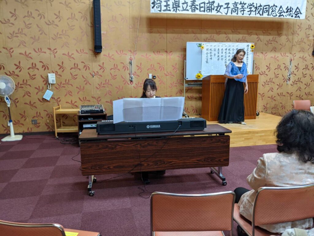 総会終了後は、記念写真撮影、そして親睦会のミニコンサートへと移り、益々盛り上がり状態でした。ミニコンサートは、島崎弥生氏の声楽、古川多津代のフルートの演奏、マンドリン・ギター部OG「ソレイユ・マンドリーヌ」の演奏でした。校歌をマンドリンの演奏に合わせて歌える喜びが、楽譜を見つめて歌う姿からもつたわってきます。美しい歌声とフルートの甘い音色、マンドリンのリズムに満たされた幸せな時間でした。これこそ女子高!!