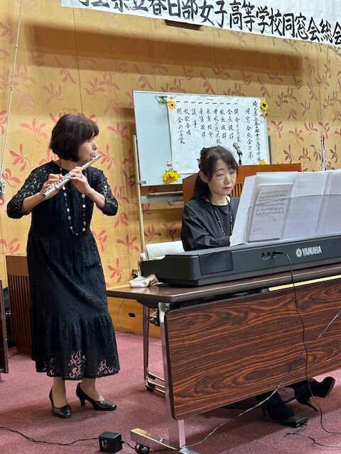 総会終了後は、記念写真撮影、そして親睦会のミニコンサートへと移り、益々盛り上がり状態でした。ミニコンサートは、島崎弥生氏の声楽、古川多津代のフルートの演奏、マンドリン・ギター部OG「ソレイユ・マンドリーヌ」の演奏でした。校歌をマンドリンの演奏に合わせて歌える喜びが、楽譜を見つめて歌う姿からもつたわってきます。美しい歌声とフルートの甘い音色、マンドリンのリズムに満たされた幸せな時間でした。これこそ女子高!!